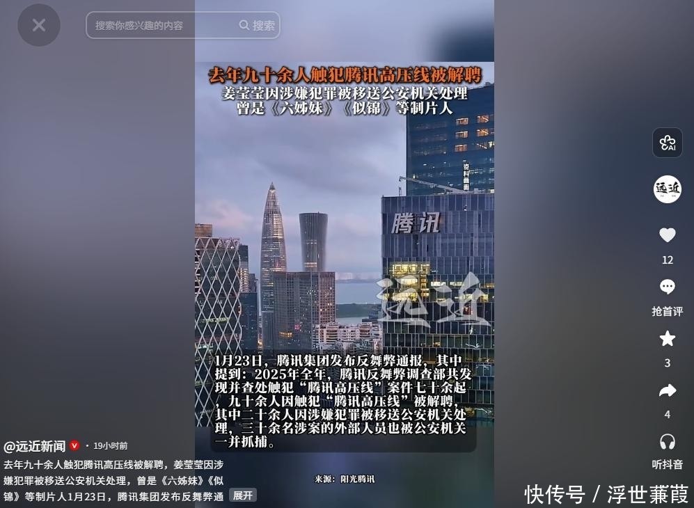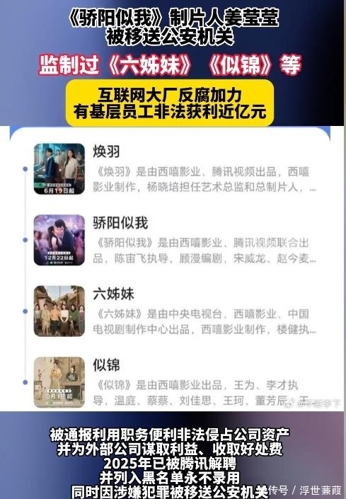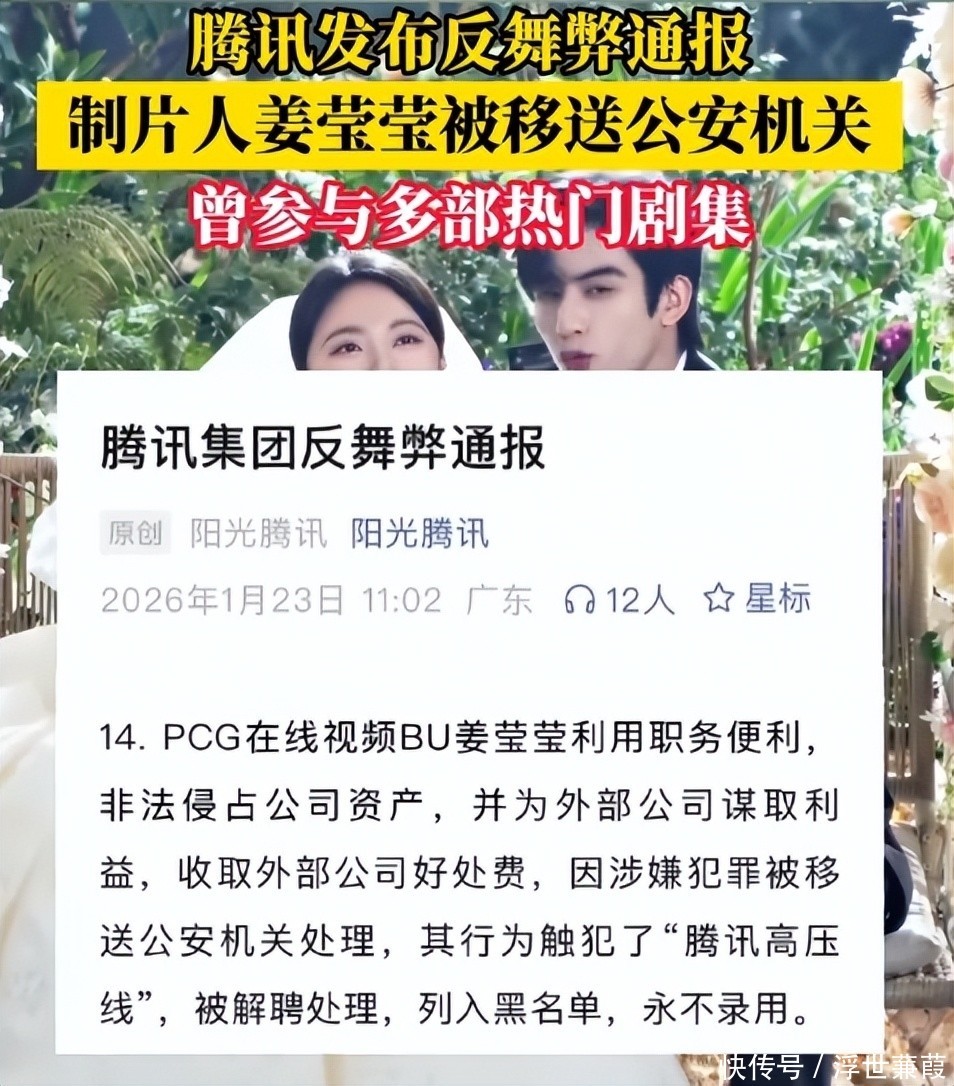 1月23日,腾讯正式对外发布《2025年度反舞弊专项通报》,其中一条通报迅速引爆全网:头部制片人姜莹莹因严重违纪违法被公司终止合作,并同步移交司法机关立案侦查。
